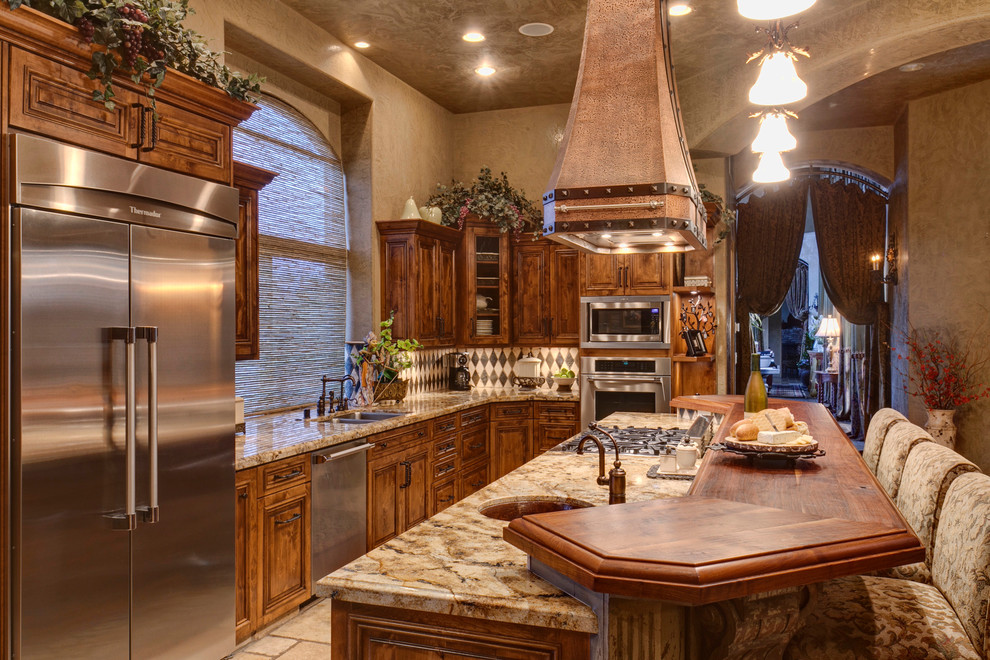A tuscan kitchen showcases the beautiful features of an italian design with rich cabinetry, warm colors and plenty of natural stone materials.